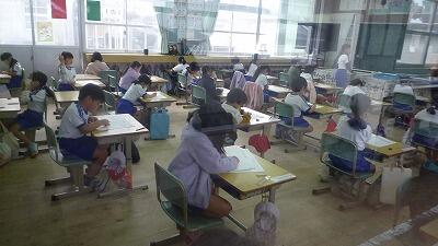 本日は国語の検査です。教室を回ってみると、校舎内が静まり返って、いつもの子供たちの活発な意見が聞こえてきません。まるで休日の学校のようです。