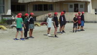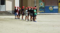 地区ごとに集まり、挨拶、並び方、横断歩道の渡り方、班長・副班長は帽子が白、