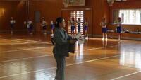 着物姿で、暑い体育館の中を駆け回り、子どもたちに丁寧に指導していただいています。