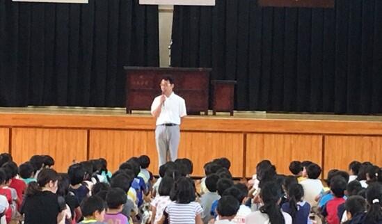 校長先生から、各学年に向けて、この1学期間でしっかりしてきたことについてお褒めの言葉がありました。最後に夏休み中の3つの約束として、「自分の命は自分で守ること」「心と体と頭を鍛えること」「規則を守ること」について話されました。