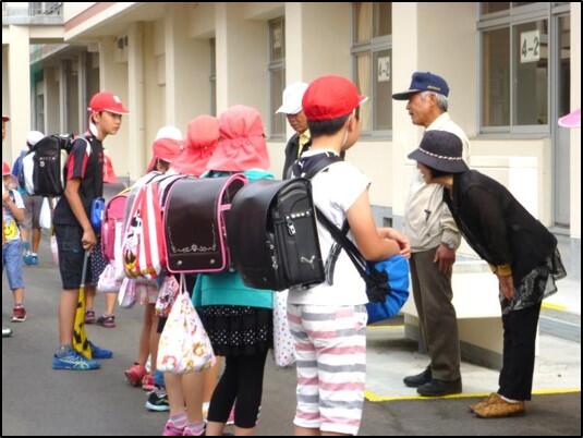 小学校の子どもたちは、お兄さんお姉さんのあいさつに、少し戸惑いながらも、元気よくあいさつを返していました。