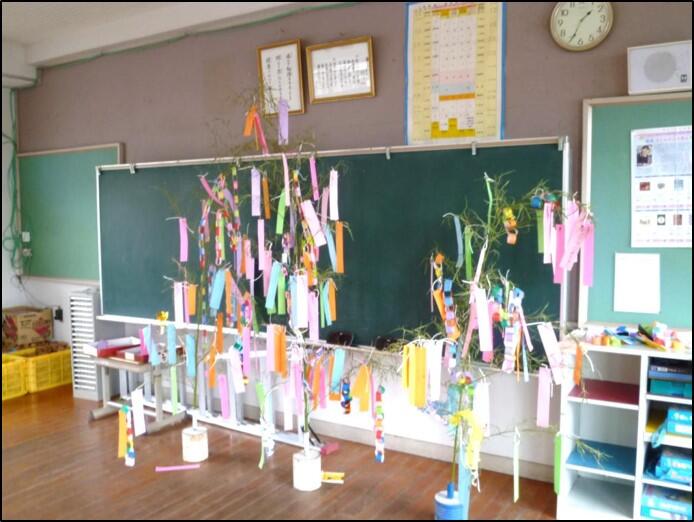 下学年の子どもたちは、短冊に願いを書いて、竹に付けていました。