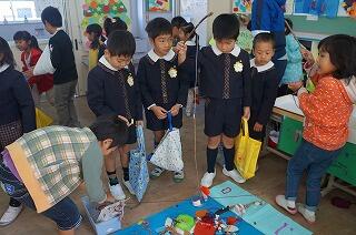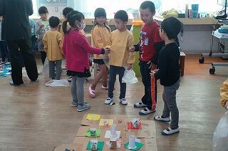 始めの会の後、3クラスに分かれて、1年生の子ども達が生活科で作ったおもちゃコーナーを使って交流を深めました。1年生が上手に園児たちを案内し、遊び方の説明をしながら楽しい時間を共有することができました
