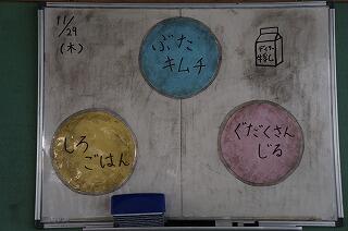 なるほど!そう思って今日の給食をのメニューを見てみました。今日は、しろごはん、牛乳、具だくさん味噌汁、豚キムチでした。ありましたね!肉が(*^▽^*)