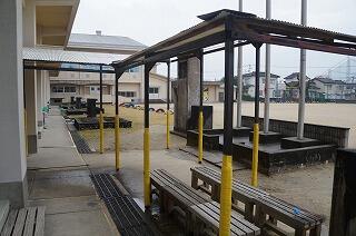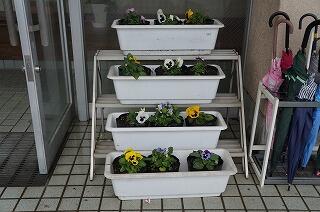 東小学校玄関の花も定期的に変えていただいています。また、子ども達のけが防止への配慮として、支柱にクッションを巻いていただきました。さらには、ハトの進入を防ぐために、網も張ってもらっています。何かあれば、すぐに対応してくださっています。