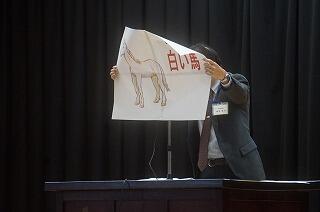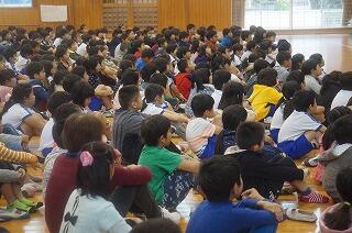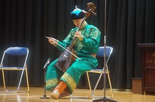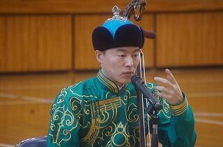 その後、校長先生の話がありました。その中で、前回の全校朝会で話をした、「スーホの白い馬」が取り上げられました。その時に話した「馬頭琴」をモンゴルの馬頭琴演奏家の方が直接演奏してくれる時間もありました。