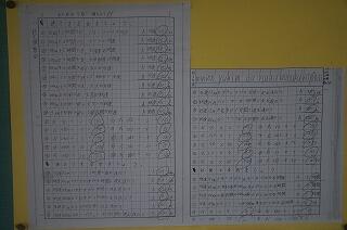 北校舎1階の多目的ホールの壁面に、字がきれいだったり、ノートの使い方が上手だったりした児童のノートのコピーが貼られています。いわゆる、ノートコンテストです。1年生から6年生までの各学級から代表として選ばれたノートですので、どのノートも大変すばらしく、みんなの参考になるものばかりです。