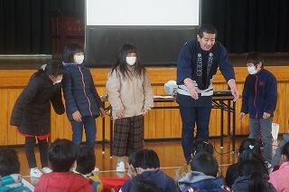 3年生が総合的な学習の時間におけるふるさと学習の中で、都城市の代表的な祭りである「おかげ祭り」について、おかげ祭り振興会副会長の山路修矛さんの話しを聞きました。山路さんの熱い思いが伝わってきました。