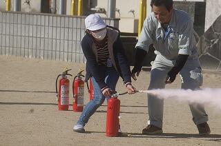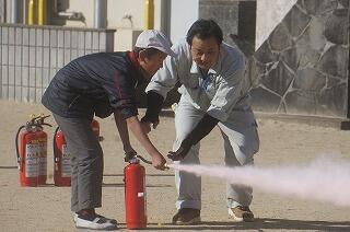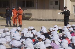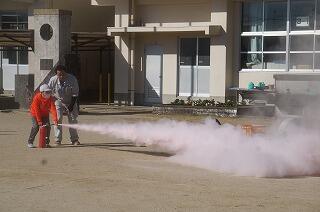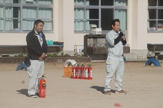 消防署の方々の話の後に、消火器を使った消火訓練があり、校長先生が最後にまとめを行って、火災の避難訓練が終わりました。