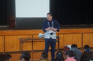 3年生が総合的な学習の時間におけるふるさと学習の中で、都城市の代表的な祭りである「おかげ祭り」について、おかげ祭り振興会副会長の山路修矛さんの話しを聞きました。山路さんの熱い思いが伝わってきました。