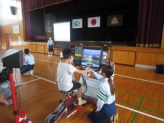 4~6年生は、自転車の安全な乗り方について学習しました。シミュレーションを使い、実際に自転車に乗っている感覚で代表が操作しました。普段より慎重になっていたようです。