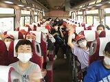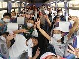 【朝の出発式の様子~校長先生の話・児童代表5の1 工藤さんの挨拶・バスの中での各クラス】
