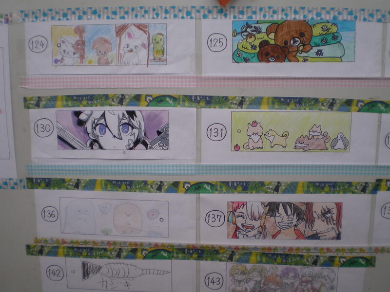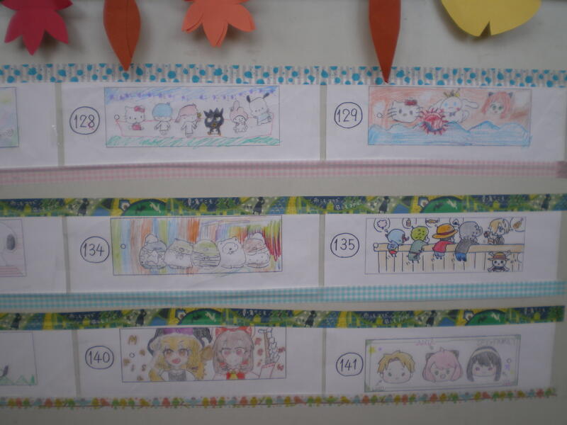 図書室の廊下壁に縦書き・横書きのイラストが描かれたしおりが貼られています。