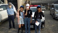 6年生の久家さん、関さん、畑中さんがパトカーに乗り、校内を巡回しながら交通安全の呼びかけを行いました。