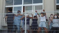 【九州大会へ出場する合唱部42名+教職員等4名に対する見送りの応援】