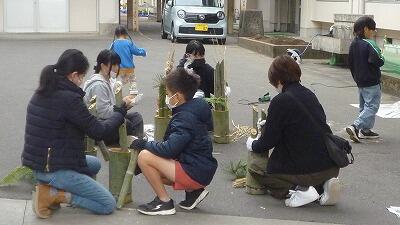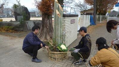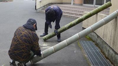 門松づくりですね。大きな竹に小さな竹を3本入れて門松を作りました。家庭教育学級の行事の一つとして実施したものです。親子で飾りつけを相談しながら楽しく活動ができました。私も竹を延々と切る作業に従事しました。手が震えてコップが持てない状態です。竹は切るのが難しいということが分かりました。