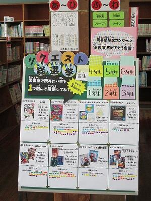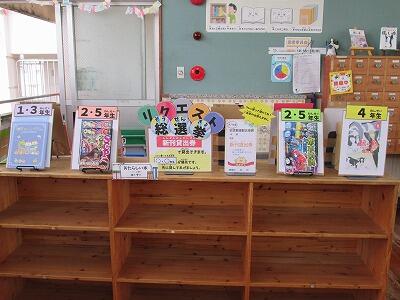 九州南部が梅雨入りしてしばらく経ちますが、思っていたよりも雨の日が少ない気がします。それでも、梅雨入りしているので、これから先、じめじめした雨の憂鬱な日が増えてくることは間違いありません。雨の日は、子どもたちが暴れてけがをしないように、室内で静かに過ごす。これが学校のルールです。静かに過ごす方法はいくつかあると思うのですが、私は図書室の本を借りて、教室でゆっくり読書を楽しむことをお勧めします。図書室に行ってみると、前回の「玉入れ競争」に引き続き、「リクエスト総選挙」というイベントが行われていました。子どもたちが読んでみたいという本を一冊選んで、学年ごとに色分けされたシールを貼ります。何と、子どもたちが一番多くシールを貼った本を購入して、図書室に常備します。ちょっと、おおげさかもしれませんが、子どもたちの夢実現プロジェクトです。どの本が選ばれるのか、時々、図書室に行って確認したいと思います。