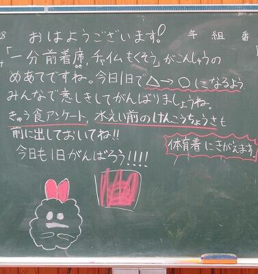 登校してきた子どもたちへのメッセージが毎日、黒板に書かれています。本年度、新規採用になった先生の教室です。おそらく、子どもたちが帰った後、明日の朝、伝えたいことを整理して黒板に書いているのでしょう。先生が直接、朝、教室で子どもたちに伝えても良いと思いますが、この先生はあえて黒板に書いているような気がします。あくまでも私の推測ですが、この先生は子どもたちに伝えたいことや、伝えなければならないことを確実に伝えるために黒板をメモの代わりにしているものと考えます。併せて、黒板に書くことで、子どもたちが自分たちで確認して、自分で行動できるようになってほしいという願いをもっているのではないでしょうか。この先生が黒板に書く意図はともかく、子どもたちが毎朝、先生から黒板にどんなメッセージが書いてあるかを楽しみにしながら教室に入ってきていることは間違いないでしょう。