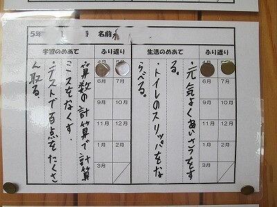 4月に子どもたちは、めあて(※今の学年で頑張りたいこと)を考えます。5年生はそのめあてをカードに書いて、廊下に掲示しています。そのカードを見てみると、5年生は学習面と生活面のめあてを書いています。6月になって、5年生の学級では、5月のめあてに対する自分の取組状況を振り返る時間を設定して、評価をしていました。評価はシールの色で決めています。シールの色は3種類あります。誰が見てもできていると自信がもてると思う時は、金色のシール。自分の中では頑張っていると思う時は、銀色のシール。頑張りが足りない、来月頑張ると思う時は、銅色のシールを貼るようになっています。このように、毎月、自分が決めためあての取組状況を自分で評価することは、自分の変化や成長、そして改善すべき点などに自ら気付くことができると思います。5年生には、この1年間で自分自身の成長を感じながら、6年生に向けて心の準備をしてほしいものです。