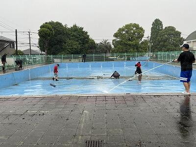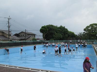 日曜日に雨の中、朝から常任委員とおやじの会の方々が、寒さに耐えながらプール清掃をしてくださいました。それも授業時間の関係から学校でプール清掃に充てられる時間が1時間しかないという事情を聞いて、動いていただいたものです。とてもありがたく思ったところです。今日の5時間目に予定通り、6年生がプール清掃を行いました。子どもたちは清掃をしながら、来週から水泳指導が始まることを実感したことと思います。いよいよ小学校最後の水泳指導が始まります。その後、職員が排水口につながる溝や、用具倉庫などの掃除を行うなど、最後の仕上げを行いました。これで、ようやく19日(木)のプール開きの準備が整いました。水泳指導を笑顔で受ける子どもたちの顔が目に浮かびます。子どもたちには9月のプール納会の時に、どれくらい泳げるようになっていたいか、しっかり目標をもって臨んでほしいと思います。