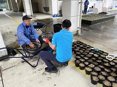 日曜日。朝から雨が降っています。そのような状況の中、本校の常任委員とおやじの会、そして担当職員が学校に出てきて、プール清掃と花づくりのための準備作業を並行して行いました。とてもありがたいことです。プール清掃については、12日(木)に6年生児童と職員で行うのですが、その日の1時間ではプール清掃が終わらないことから、常任委員とおやじの会の方々が木曜日のプール清掃が時間内に終わるように、雨の中、プール内外の清掃をしてくださいました。おかげさまで、木曜日は1時間でプール清掃が終わり、予定通りの日程でプール開きが行えそうです。一方、渡り廊下のところでは、常任委員と本校職員が花が咲いていたポットを集めて、ふるいにかけて土の分別をしました。その後、学級花壇に土を補充したり、使用済みのポットが次、すぐ使えるように中を水洗いしたりしました。約1時間程度で、予定していた作業を終えることができました。どちらとも、雨の中でしたが、無事予定していた作業をすべて終えることができました。参加していただいた皆様に、心から感謝申し上げます。ありがとうございました。