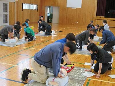 本校は、6月19日(木)がプール開きです。子どもたちは、その日が来るのを今か今かと楽しみにしていることでしょう。そのような子どもたちの気持ちとは裏腹に、水泳指導は体育の授業の中でも最も危険を伴う学習と言っても過言ではないので、私たちはいつも以上に緊張感をもって指導に当たります。子どもたちの命を守るために、職員による緊急時の対応マニュアルの確認、水泳指導前の健康チェック、入念な準備運動、安全指導はもちろん、できるだけ複数の目で観て水中で活動している子どもたちのわずかな変化に気付くような監視体制の下、実施することとしています。しかしながら、水泳指導の場合、それでも子どもの命を脅かす状況が起こらないという保証はありません。このことから、本年度も都城消防署の方を講師にお招きして、職員を対象に救命救急法(心肺蘇生法)講習会を実施したところです。毎年、この時期になると、救命救急法講習会を実施しているので、今回の講習会をとおして職員は、救命救急法の手順を再確認することができたようです。いよいよ水泳指導が始まりますが、9月のプール納会まで水の事故がないように学校として細心の注意を払いながら実施していきたいと思います。