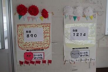 先月から子どもたちの読書意欲を喚起することを目的として、図書館サポーターの発案により、本校の運動会シーズンにあわせて「玉入れ競争」をしてきました。そのルールは、子どもが図書室の本を1冊借りると、自分の団の色のシールを1枚もらって、自分の団のかごの中に貼って数を競うというものです。約1か月の玉入れ競争でしたが、過日、図書室前の壁に結果が発表されていました。結果は、画像にある通り、赤団が890冊、白団が1214冊、青団が963冊でした。このことから、今回の玉入れ競争の優勝は、白団でした。玉入れ競争は終わりましたが、今、梅雨時期で雨の日が多いので、子どもたちには図書室の本を借りて、本のよさを感じたり、本からいろいろなことを学んだりしてほしいと思っています。ちなみに、5月25日(日)に行われた運動会は、青団が優勝でした。