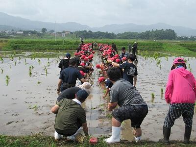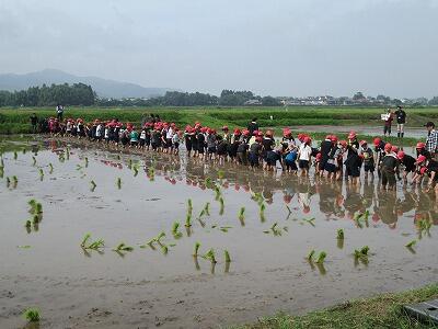 27日(金)は、朝から晴れて、気温が上がりました。そのような厳しい状況でしたが、熱中症対策をしつつ5年生が田植え体験をしました。この体験は毎年恒例となっており、今年もJA青年部の方々やお助け人などの協力を得て実施することができました。子どもたちは、駐車場で苗を植える際の注意事項等を聞いた後、田んぼに入って、2列になって苗を植えました。中には、足が泥の中にはまって、こけてしまう子どももいましたが、それもよい体験になったのではないかと思います。今回、子どもたちが体験したのは、昔の田植えです。今は田植え機などが導入され、あっという間に田植えが終わる時代になっています。この体験をとおして、子どもたちに昔の人の米作りの大変さを実感させるとともに、近年、田植え機やコンバイン、ドローンなど機械の導入により、米づくりはかなり進歩していて、効率化やスマート化が図られていることを理解させる必要があると思います。社会科の授業の中で、その点をしっかり押さえておかないと、将来、農業に従事しようと思う子どもが減ってしまうものと考えます。このことから、先生には社会科の授業をとおして、近年の農業の機械化と効率化、そして農業の魅力を伝えていくことが求められていると思います。