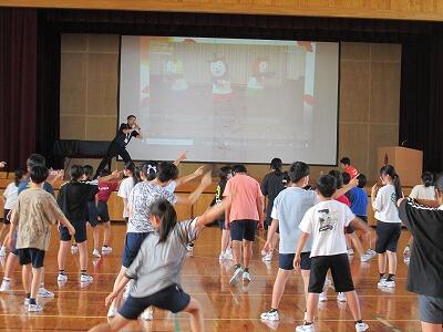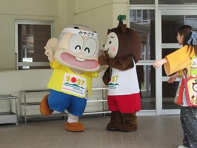 2027年9月26日(日)から宮崎県で国スポ・障スポが行われます。国スポ(国民スポーツ大会)と障スポ(全国障害者スポーツ大会)は、都道府県の持ち回り方式で毎年開催されている国内最大のスポーツの祭典です。県は大会イメージソング「ひなたのチカラ」を公募により制作しており、「県民総参加型」のおもてなしの心あふれる大会の実現を目指しています。この大会イメージソングには、ダンスがあって、出前授業をとおして、県はその普及に努めています。今回、その出前授業が本校6年生を対象に行われました。当日は、都城市の公式キャラクター「ぼんちくん」と、宮崎県の公式キャラクター「みやざき犬のむぅくん」も登場し、県の国スポ・障スポの担当者の指導の下、子どもたちと一緒に踊りました。子どもたちは、とても楽しそうに踊っていました。11月の陸上教室でこのダンスのプロモーションビデオの撮影があるので、子どもたちは自信をもって臨むことができるのではないかと思います。