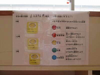 先週は、天気図から梅雨前線が消えて、暑い日が続きました。しかし、今日は、また梅雨空に逆戻りしています。今年の梅雨明けは例年に比べて、早いのではないかという話もありますが、どうなのでしょうか。暑いと気になるのが、熱中症です。本校では、熱中症対策の一つとして、養護教諭又は養護助教諭が児童玄関のところに、時間に分けて今日の暑さ指数(WGBT)が分かる表示をしています。子どもたちは、登校してきた時にその表示を観て、行動するようにしています。ちなみに、今日は、すべての時間において黄色のマークで警戒レベル「休けい・水分をとりながら運動をしよう」となっていました。この結果から今日の昼休み、子どもたちは水筒持参で水分補給しながら運動場で遊ぶことができます。この状況が低学年の子どもにも理解できるように、学級担任による指導に加えて、養護教諭や生徒指導主事が給食時間の放送で今日の暑さ指数を伝えて注意喚起を行っています。梅雨時期だと油断することなく、熱中症対策を適切に行いながら、子どもたちが安全に生活できるようにしていきます。
