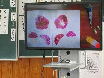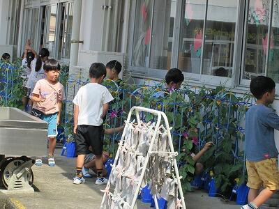 1年生が育てる植物として有名なのは、朝顔です。朝顔はいろいろな色の花が咲いて、人の目を楽しませてくれます。本校も例外ではなく、教室の外で1年生が、朝顔を育てています。今、青色のプラスチック製の鉢の中で育てられた朝顔は、子どもたちの首のあたりまで成長しています。これまで子どもたちは、朝顔に水をあげながら成長を記録してきています。しばらくすると、花が枯れてしまうことから、今日、1年生はこれまで育ててきた朝顔の花を使って、たたき染めをして紙面に花の美しさを残そうとしていました。これまで水をあげるなどして大切に育ててきた朝顔の花が記念に残るのは、よい取組だと思ったところでした。朝顔のたたき染めが出来上がったら、家に持って帰って、おうちの人に見せてほしいと思います。できれば、部屋のどこかに飾ってほしいですね。