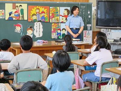 今日は都城警察署の方を招いて、3年生を対象に非行防止教室を行いました。内容は、万引きに関するものです。子どもたちは、場面絵を見ながら万引きに至るまでの過程を理解し、主人公がお店の人に万引きが見つかって警察に連れて行かれた時の気持ちと、その時の家族の気持ちについて考えました。ワークシートを観てみると、どの子どもも自分なりの考えを書いていました。このことから、子どもたちは警察署の方の話を聞いて、万引きは絶対してはいけないという気持ちになったものと思います。本校では、万引きという犯罪行為から子どもたちを守るために、お金を持っていないのに子どもだけでお店に入らないというきまりを提示して、保護者に協力をお願いしています。お金を持っていないのにお店に入らないことはもちろん、お金の与え方や使い方を含めて、各家庭においてお子さんに話をしていただけると助かります。