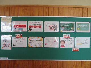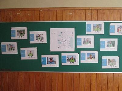 過日、見守り隊の方々と民生児童委員の方々を招いて、対面式を兼ねた子どもたちによる感謝集会を行ったところです。集会では、6年生代表児童による作文発表、全校児童による歌や4年生からのお手紙のプレゼントをとおして、子どもたちの感謝の気持ちを伝えたところでした。それからしばらく経っていますが、1年生の学年掲示板に校区内の地図と見守り隊の方々の写真と名前が掲示してありました。対面式の中でお一人お一人に自己紹介をしていただきましたが、1年生は顔と名前を覚えるまでには至っていなかったものと思われます。そこで、1年生の先生方が自分の通学路に立っている見守り隊の方の名前を覚えてほしいという願いから、校区内の地図と立っている場所、そして顔写真と名前を掲示したのだと考えます。子どもたちには、顔と名前を覚えて、感謝の気持ちを込めて、明るい挨拶をしてほしいと思います。学年主任の話によると、今、1年生が育てている朝顔の種を見守り隊の方々にプレゼントする予定だそうです。