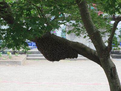 先日、子どもから「木の枝の所に蜂がたくさんいます。」との報告がありました。画像を見て分かるように、ミツバチの大群が球のようなかたまりをつくっています。調べてみると、女王バチが木の枝などにおちつくと、そのまわりを働きバチが取り囲み、球のようなかたまりをつくるそうです。そして、その中から何匹かの働きバチが飛び立ち、新しい引っ越し先を探しに行くとのことでした。今、本校の池のところの木陰で、ミツバチが引っ越しの準備をしています。子どもたちが近づかないようにしていますが、誰一人石を投げるなど、ミツバチを刺激する子どもはいません。温かく見守ってくれています。ミツバチは、長くても1週間くらいで次の引っ越し先に移動するそうなので、この様子が見られるのも残りわずかです。今日で3日目。いつミツバチは、飛び立っていくのでしょうか。