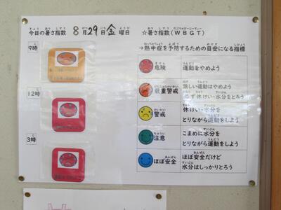今日は8月29日。本当に毎日暑いですね。暦の上では、8月下旬から9月上旬までを秋らしくなってきたことを意味する「新秋」と言います。しかしながら、秋らしさを感じることはありません。むしろ、夏真っ盛りといった感じさえします。学校では、児童玄関に子どもたちに熱中症指数を基にしたマークを示すことで、外での活動の可否や注意事項を伝えています。また、下校時は、熱中症対策として子どもたちに必ず水筒の水を飲んで下校するように指導しています。今週は午前中授業で昼休み時間がないので、子どもたちの外遊びに制限をかける必要はなかったのですが、来週からは通常の校時程に戻るので、このままの状況が続けば、子どもたちが昼休みに外で遊ぶことを制限せざるを得なくなると思います。この暑さが早く収まって、子どもたちが安心して外遊びができるようになってほしいものです。