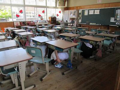 9月1日は、防災の日です。上長飯小ではこの日にあわせて、毎年地震を想定した避難訓練を実施しています。今回の避難訓練のねらいは、子どもたちが授業中に地震が起こった時に身の安全を確保するための方法を学ぶものでした。これまでの避難訓練は、地震を感じたら子どもたちは机の下にもぐって、自分の頭や体を落下物から守り、地震が収まったら、先生の指示により運動場に避難していました。しかし、子どもたちが生活している校舎は、耐震化が図られており、安全な場所になっています。このことから、地震が収まった後、運動場に避難することはやめています。地震は今回の避難訓練のように、授業中に起こるとは限りません。子どもだけで家にいる時、学校の行き帰り、公園で友だちと遊んでいる時、運動場にいる時などいろいろなケースが考えられます。子どもたちが自分の命を自分で守るために、日頃から今、自分がいるところで地震が起きたら、どこに避難するかを考えさせておく必要があると思います。どこにいても大切なことは、壊れそうな建物や壁の近くから離れること、上から物が落ちてきそうなところには近づかないこと、自分の頭を守ることの3つだと思います。ご家庭でも保護者不在の時に、地震が起こった時の対応について、お子さんと話をしておかれることをお勧めします。