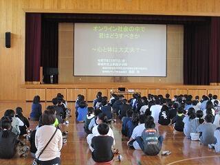 学校で行われる学校保健委員会は、保護者を対象に行います。しかし、今回の学校保健委員会がメディア関係の内容だったこともあり、保護者に加えて5、6年生も参加しました。講師は、都城市教育委員会生涯学習課の横田浩さんで、テーマは「オンライン社会の中で、君はどうすべきか。~心と体は大丈夫?~」でした。講師の横田さんには、事前に子どもたちが参加することを伝えていたので、子どもたちに分かりやすい内容構成になっていました。今、オンライン社会の中で生きている子どもたちに、SNSを使わせない、オンラインゲームをさせないというのは難しいと思います。だからといって、時間制限などのルールもなく、すべて子どもに任せてしまうのは危険です。オンライン社会の中で子どもが加害者にも被害者にもならないように、また子どもが心身ともに健康な状態でいられるように、各家庭において子どもと話し合いながらルールを作って、そのルールをしっかり守ってオンラインゲーム等を楽しむことが望まれます。