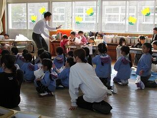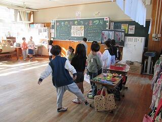 学校の近くの幼稚園や保育園に通う園児が先生方に引率されて、上長飯小にやってきました。今日は1年生と園児との交流授業の日です。園児が到着する前に1年生の教室をのぞいてみると、黒板に大きく「秋のおもちゃ祭り」と書いてあって、子どもたちが「はじめの会」と「終わりの会」の進行や、園児がするゲームの説明の練習をしていました。すっかりお兄ちゃん、お姉ちゃん気分で、おもちゃ祭りが始まるのを今か今かと待っているようでした。子どもたちが準備したゲームは、どんぐり的当てゲームなど木の実を使ったものばかりでした。それを見てすぐに、秋のおもちゃ祭りという名前が付いていることに納得したところです。1年生は園児を目の前にして練習通りにゲームの説明をして、コーナーに分かれてゲームをさせていました。どの子も園児がゲームを楽しんでいたので、とても満足した表情をしていました。