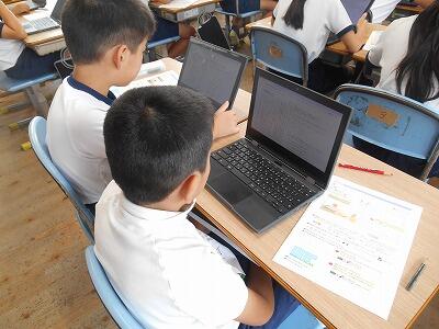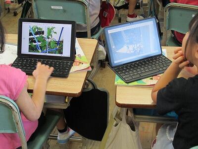 2時間目に校内を回っていたら、1年生がタブレット端末を出して何かしていました。