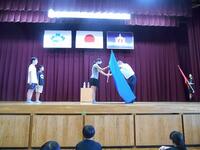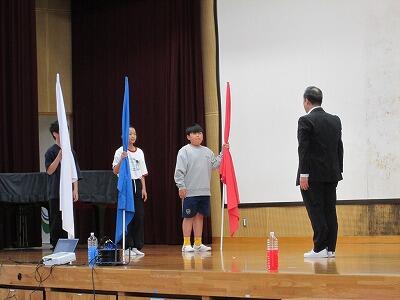 団旗を授与した後、校長が全校児童に対して、「運動会の主役はみなさん、一人一人です。運動会当日、自分のもっている力を精一杯出せるように頑張ってください。」と話しました。今年はどの団が優勝、応援賞を取るのでしょうか。