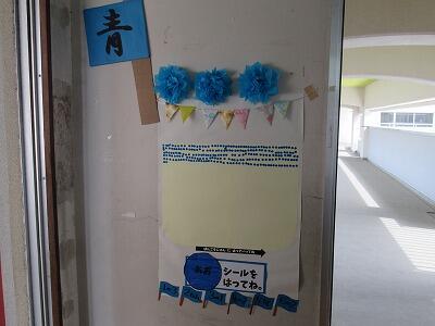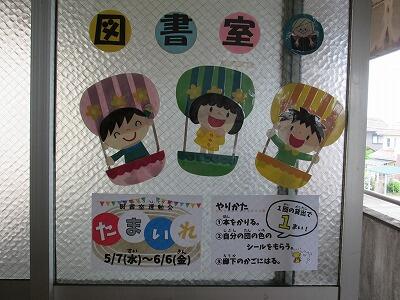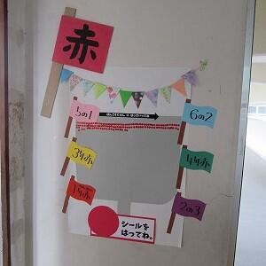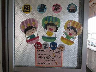 24日(土)の運動会に向けて、子どもたちは毎日練習に取り組んでいます。今日も1時間目に全校体育で、全校リレーや応援の練習を行いました。ただ、天気予報によると、天気がよいのは今日までで、明日以降、雨の日が続くとのことです。明日から来週にかけて雨の影響により練習する機会が減ってしまうものと思われますが、24日(土)は、予定通り、多くの保護者や祖父母、地域の方々等に見守れ、声援を受けながら運動会が実施できることを切に願っています。図書室に行ってみると、入口の戸に図書室運動会の説明が書いてありました。なんと、図書室前でも運動会が行われているようです。種目は、玉入れです。ルールを読んでみると、図書室で本を1冊借りると、自分の団のシールが1枚もらえて、それを掲示されている自分の団のかごの中に貼って競うようです。明日以降、雨の日が続くので、図書室で本を借りて、子どもたちには、静かなもう一つの運動会「玉入れ」を楽しんでほしいと思います。