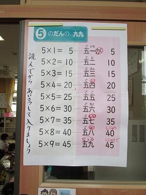 2年生の教室の入口にかけ算九九が貼ってありました。かけ算九九を言ってから教室の中に入りましょうとの一言が付け加えられていました。かけ算九九は、繰り返し繰り返し練習しなければ、自分のものにはなりません。