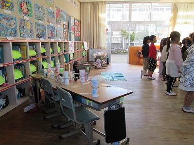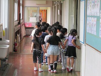 担任の先生を先頭に、1年生が廊下を歩いています。校長室の前に止まると、担任の先生が子どもたちに「ここが校長室です。校長先生がお仕事をする部屋です。」と説明していました。その後、次々に子どもたちが校長室の中に入ってきて、ぐるっと見渡して校長室を出ていきました。子どもたちは壁に歴代のPTA会長や校長の写真がたくさん掲示してあるので、それに少しびっくりしたようでした。1年生は入学してまだ1か月も経っていないので、行動範囲が狭く自分の学級以外のことはほとんど分からないと思います。今日の学校探検をとおして、学校にはいろいろな部屋があって、その部屋の役割が学べたのではないかと思います。1年生は、今日の学校探検を楽しめたでしょうか。