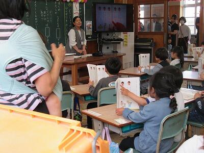 教室から楽しそうな声が、、、。教室に入ってみると、子どもたちがALTの先生と一緒に楽しそうに英語のかるたをしていました。机の上にカードが置いてあって、子どもたちは手を頭の上においていました。その状態で、ALTの先生が言ったカードを見つけてすばやく取っていました。負けず嫌いの子どもが多いようで、教室内はかなり盛り上がっていました。カードをよく観てみると単語(例:school)ではなく、文(例:go to school)のような短い英文が書かれていました。時代の求めとはいえ、改めて小学生でここまで英語を学習することに驚きを感じざるを得ませんでした。楽しく英語を学ぶことは、とてもいいことですね。