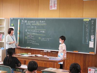 授業の主役は子どもたちです。子どもたちを授業の主役にするためには、子どもたちが考える時間、子どもたちが考えを伝える、あるいは伝え合う時間をしっかり確保する必要があります。と同時に、先生は意識して話す時間を減らしていかないといけません。今、学校を挙げて、先生が脇役に徹し、子どもたちが主役の授業づくりに取り組んでいます。今日の2時間目に3年生の算数の授業で、子どもが先生の代わりに計算の仕方を堂々と説明している場面を見かけました。これまでは先生が子どもたちに解き方や考え方を説明して、「分かりましたか。」と尋ねて、子どもたちが「分かりました。」と答えて終わっていたところがありました。これでは、子どもたちは分かったつもり、できるようなつもりになってしまいがちです。そのような状況に陥らないためにも、実際に計算式を使って子どもに説明させてみることはとても大切だと思います。併せて、子どもたち一人一人に緊張感や当事者意識をもたせるために、先生が指名して子どもに説明させるなど誰が前に出て説明するか分からないような状況をつくっていくことも時には必要かもしれません。