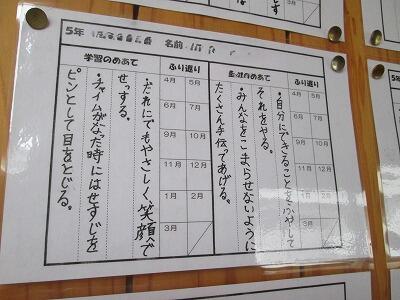 おそらく、どこの学校でも4月の1週目あたりに、みんなで学級の目標を考えたり、子どもたちが新しい学年になってどんなことに力を入れたいかという、自分の目標を決めたりする時間を設定しています。そして、それらを意識しながら生活するために、学級目標は教室の後方に、自分で決めた目標を書いたワークシート等は、教室の背面や廊下の壁等に掲示します。ここまでは、どこの学校や学級でも行っていることです。何気なく5年生の廊下に掲示してあったワークシートに目をやると、自分が決めた目標を月1回振り返るようなチェック欄があって、年間を通して記録できるようにしてありました。このように振り返りの欄を設けることで、子どもたちがその月の自分の目標に対する取組を振り返り、自分の成長を実感できるようになると思います。大切なことは子どもたちが年度当初に決めた目標を意識して、その時その時に達成できているかどうか、振り返りながら生活することです。きっと5年生は自分の目標に向かって頑張ってくれることでしょう。