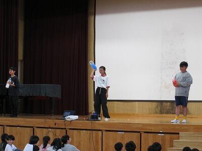 今回の結団式の目的は、団の色を決定し、団長、副団長、応援リーダーと同じ団の子どもたちと顔合わせを行うことでした。団の決め方ですが、全校児童が見守る中、ステージの上で団長が水の入ったペットボトルを選んで振って、その水の色で団の色を決定しました。