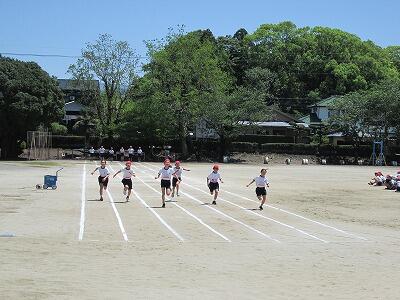 本校の管理棟の校舎改築に伴って、本年度は運動会を5月24日(土)に実施することにしています。そのため、4月早々からどの学年も運動会に向けて準備を始めています。運動場を見てみると、強い風が吹く中、3年生が50m走を行って記録をとっていました。その結果を基に、全校リレーや学年リレーの選手を決めるのだと思います。感心したのは、走り終わった子どもたちがきちんと整列して座って待っていたことです。このことから、3年生が落ち着いていることが分かりました。これから運動会本番に向けて、団技や表現の練習も始まってくると思います。体調管理に気を付けて、できるだけ休むことなく運動会の練習に臨んでほしいものです。