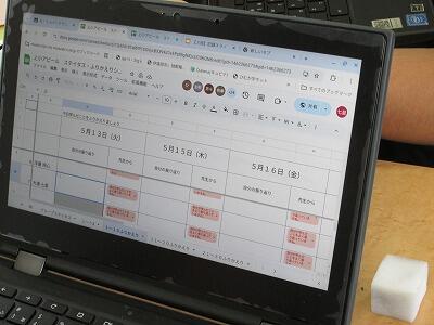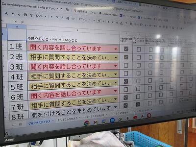 今日の3時間目に6年生の国語の授業を参観しました。授業全体で先生が話した時間は、約5分。残りの40分間、先生は子どもたちのグループ学習の様子を見守ったり、子どもたちの質問に答えたりするだけでした。なぜ、そんな授業ができるのか?その答えは黒板にありました。事前に黒板に学習の最終ゴール、「学校のよいところをインタビューして、上長飯小アピールをつくり、みんなに紹介しよう」が示してあり、毎時間の学習の流れが順番に書いてありました。つまり、子どもたちは先生から指示されなくても、自分たちで学習を進めていけるようにきちんと学び方を学んでいたわけです。テレビ画面には、8つのグループの学習の進捗状況が表示されていて、先生は全体の学習進度を確認しながらサポート役に徹していました。グループ学習の様子を見てみると、画面に表示してある通り、グループによって進捗状況はさまざまで、相手に質問することを決めていたり、聞く内容を話し合っていたり、気を付けることをまとめたりしていました。学習のゴールと時間がはっきりしているので、子どもたちは自分たちのペースでグループの友だちと意見交換をしながら真剣に学習を進めていました。さすが上長飯小の6年生だと感心したところです。本時の学習の振り返りは、スプレッドシートをつかって行っていて、全体で感想等を共有していました。まさに、子どもが主役の授業が展開されたのではないかと思います。