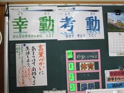 「ウェルビーング」という言葉があります。この言葉には、多様な個人がそれぞれ幸せや生きがいを感じるともに、個人を取り巻く場や地域、社会が幸せや豊かさを感じられる良い状態にあることも含まれています。今、この「ウェルビーング」という視点が学校教育に求められています。そのような中、6年生の教室に行ってみると、「幸動」と「考動」という2つの言葉が掲示されていました。どちらとも、読みは「こうどう」です。前者の「幸動」は、みんなの幸せのために動くという意味です。後者の「考動」は、自分で考えて動くという意味です。この2つの言葉を6年生の教室に掲示していることからも分かるように、本校の6年担任の願いは、子どもたちに「ウェルビーング」の考え方に基づいて、学校生活をよりよく送ってほしいということだと思われます。これから6年生には「幸動」と「考動」の実践をとおして、よりよい人間関係を築くことにより、1人1人の居場所があり、幸せを感じられる親和的な学級を創るとともに、地域社会に貢献できる最上級生に成長してくれることを期待しています。